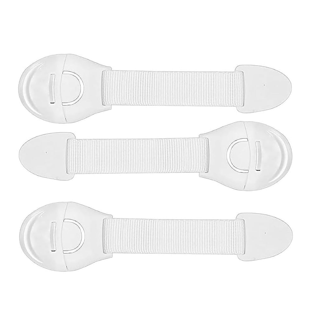 - Child safety strap locks are made of high-quality ABS plastic, and the strap can bear high tension force. Adhesive will hold toughly and does no damage to any furniture surface. Easy to remove later.